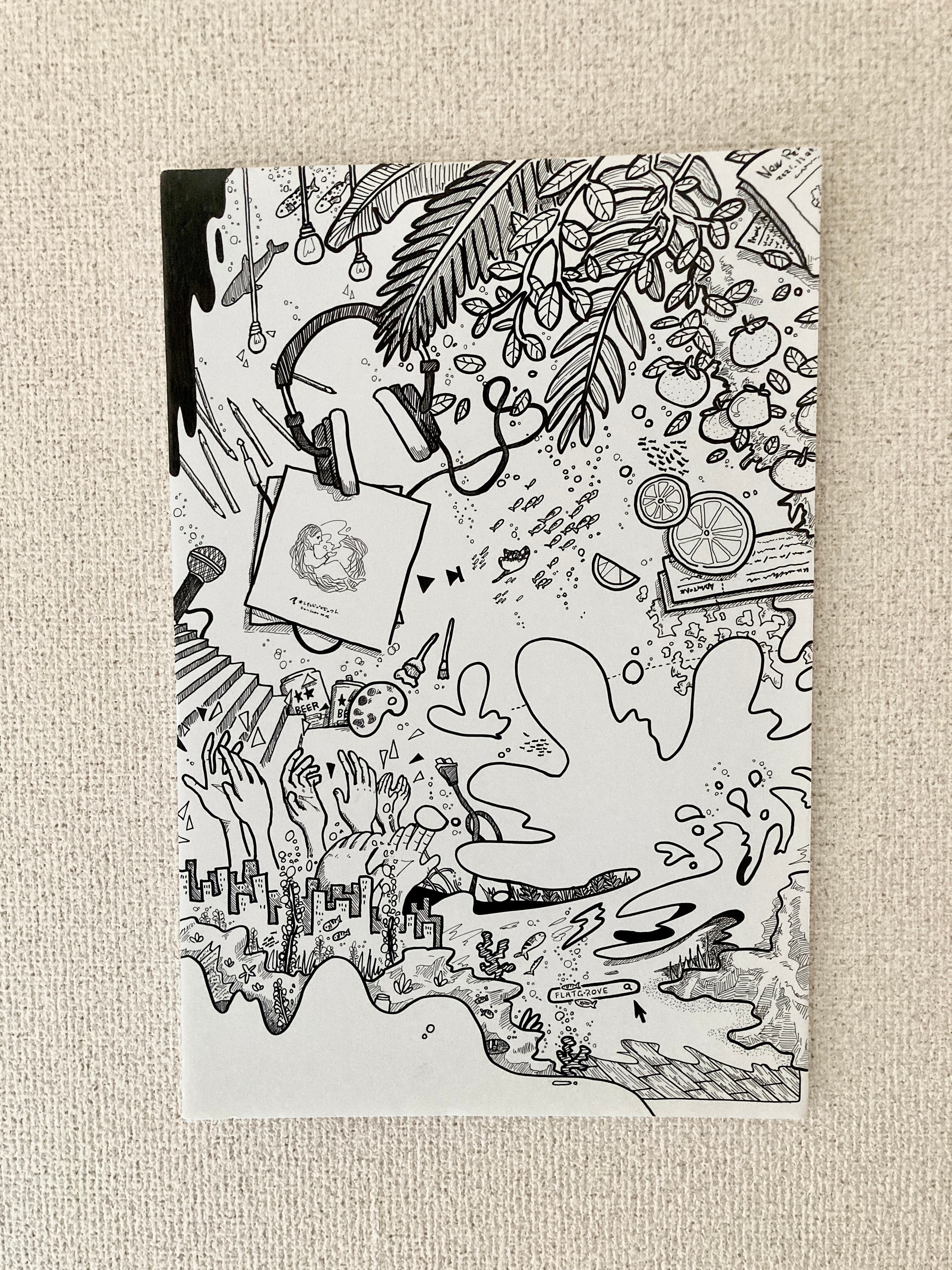 ひらばやしが水性の黒ペンで手書きで一枚ずつ描きます。